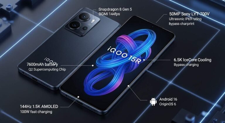 iQOO 15R Price in India: 7600mAh बैटरी और Snapdragon 8 Gen 5 वाला गेमिंग पॉवरहाउस ₹50,000 से कम में iQOO 24 फरवरी 2026 को भारत में अपना नया गेमिंग-फोकस्ड स्मार्टफोन iQOO 15R लॉन्च करने जा रहा है । कंपनी ने इस फोन को “परफेक्ट फिट” डिवाइस बताया है, जो परफॉर्मेंस और डिजाइन के बीच बैलेंस बनाता … Continue reading iQOO 15R Price in India: ₹47,999 से ₹54,999 में 7600mAh बैटरी और 144Hz डिस्प्ले वाला गेमिंग पॉवरहाउस | फरवरी 2026